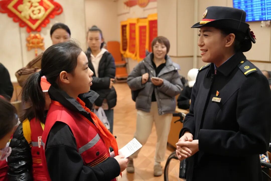 在进站大厅里,小记者们探访了一间特殊的房间——“京铁爱心”服务室,这里是为老、弱、病、残、孕等特殊旅客群体提供专业服务的地方。在这个温馨的房间里,小记者们见到了北京站京铁爱心服务组第三任班组长杜京林阿姨。杜阿姨给大家介绍了“京铁爱心”服务组(素萍服务组)秉承“待旅客如亲人”的理念,代代传承的故事。“从创始人李素萍奶奶,到第二代传人曹燕阿姨,再到现在的第三代传人杜京林阿姨,一代代铁路人一直在捧着真心做事,太令人感动了。”小记者段柯辛忍不住感叹。