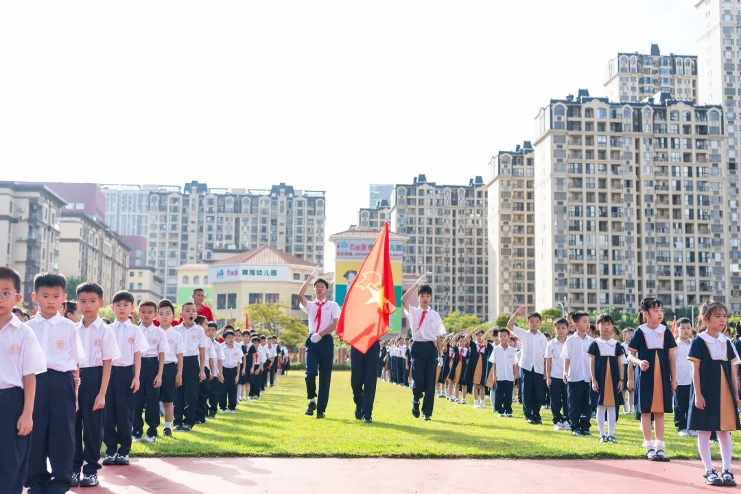 在呼号环节中,金湾学校党总支书记、少工委主任吴晓哲高声领呼:“准备着:为共产主义事业而奋斗!”全体队员齐声回应:“时刻准备着!”声音整齐洪亮,彰显了少先队员听党话、跟党走的坚定信念。仪式在庄严的退旗曲中圆满落幕。