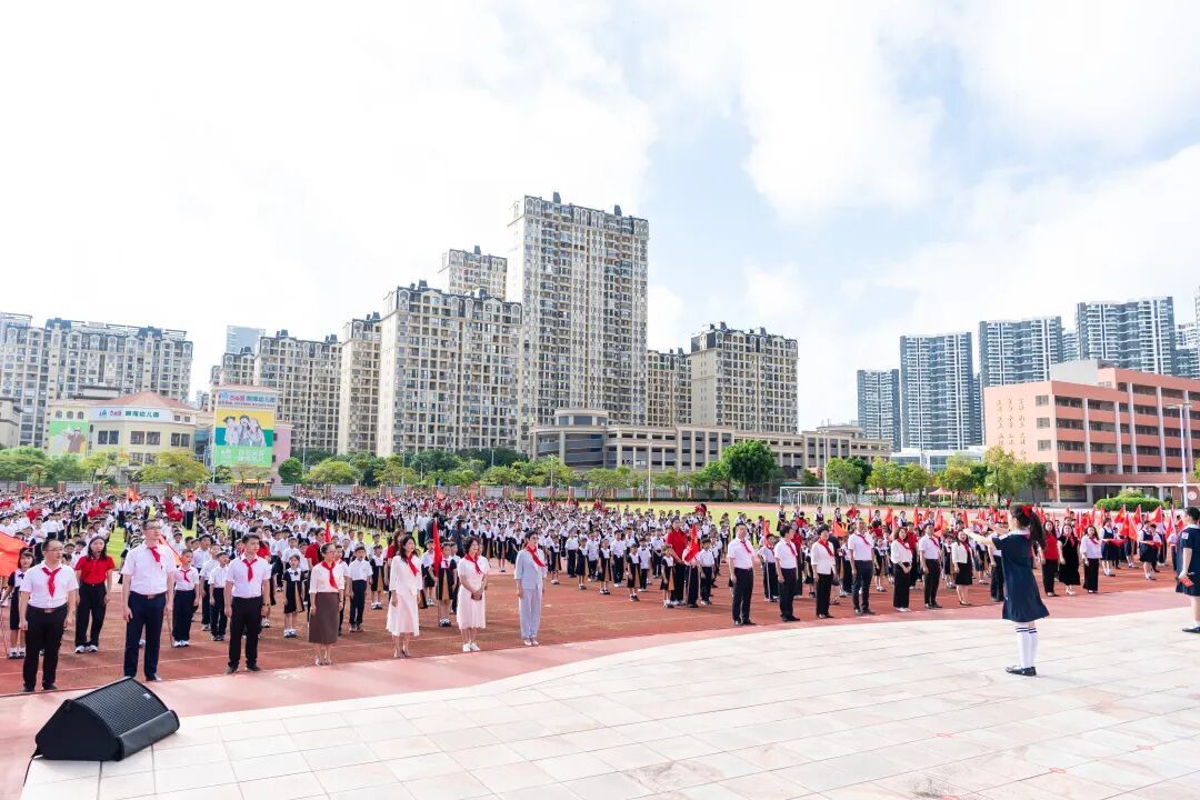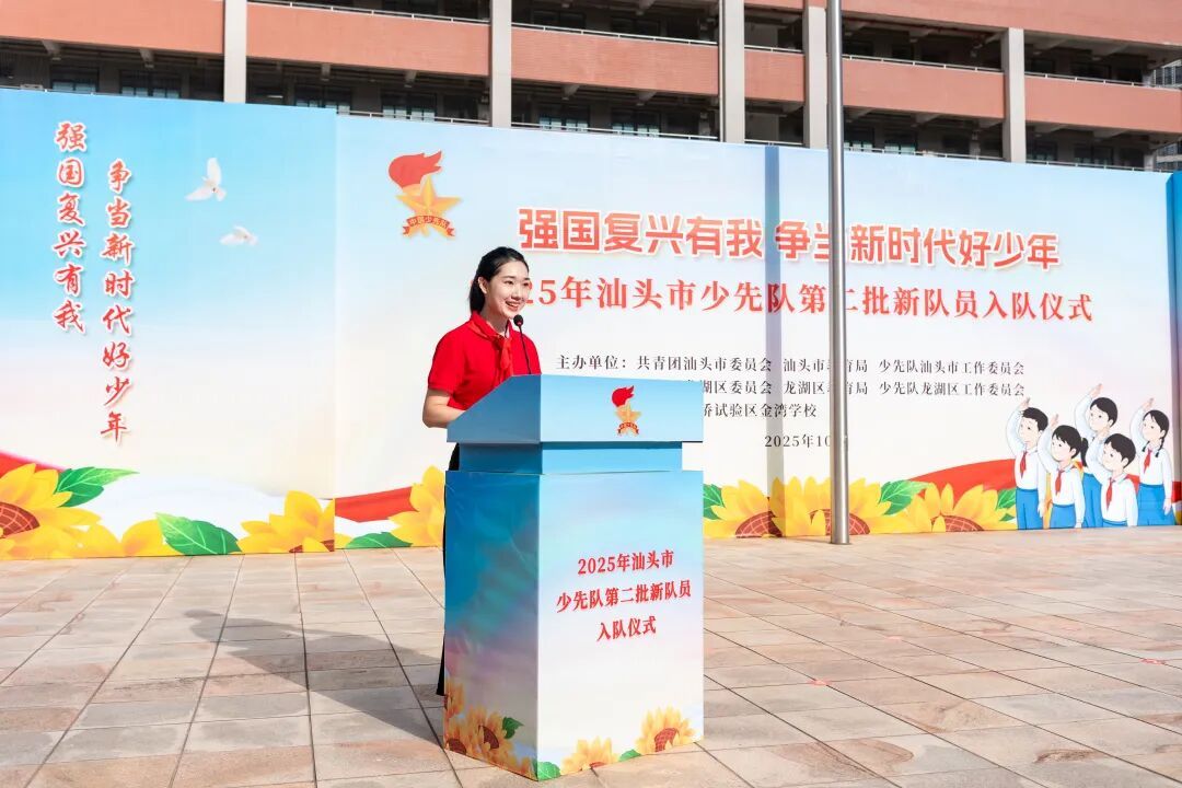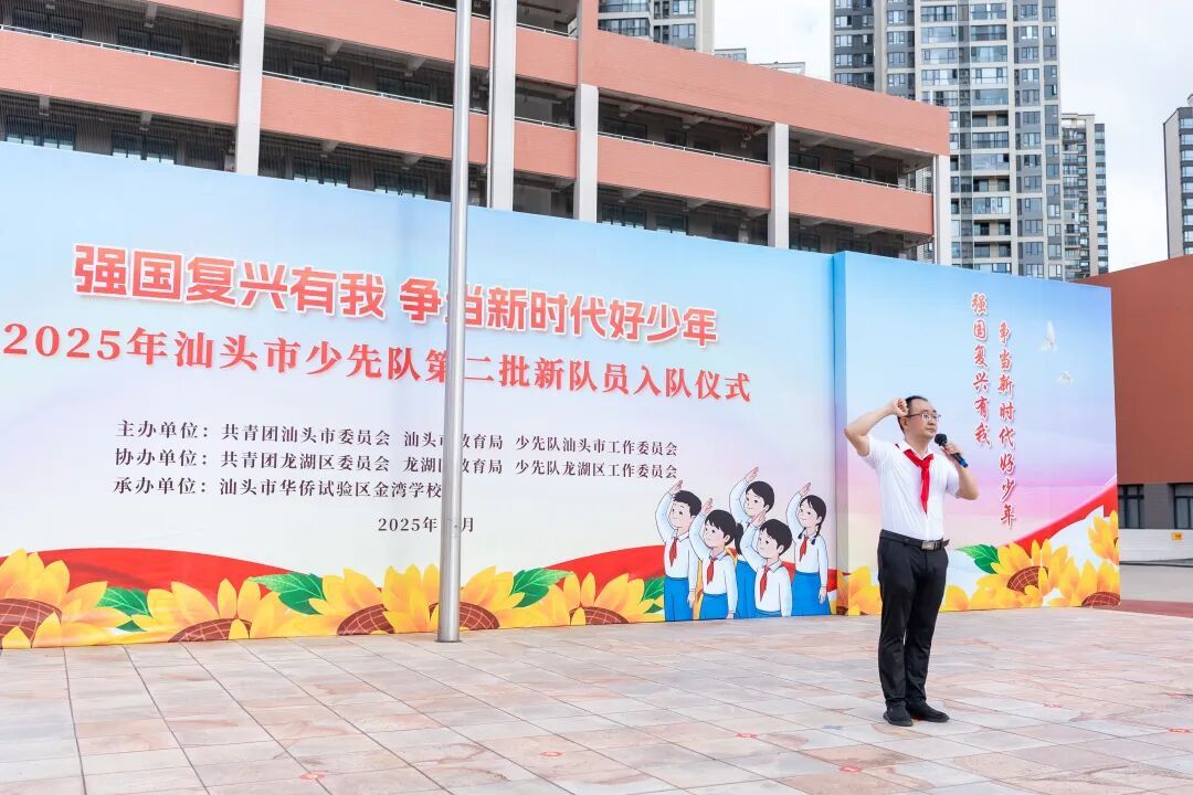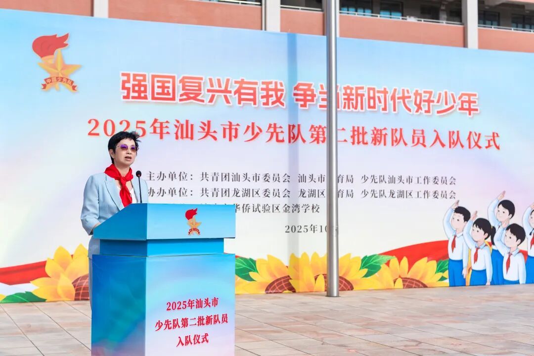 为深入学习贯彻党的二十大和二十届二中、三中全会精神,认真落实习近平总书记关于少年儿童和少先队工作的重要论述,庆祝中国少年先锋队建队76周年,切实增强少先队员的光荣感与组织归属感,10月13日上午,由共青团汕头市委员会、汕头市教育局、少先队汕头市工作委员会主办,共青团龙湖区委员会、龙湖区教育局、少先队龙湖区工作委员会协办,汕头市华侨试验区金湾学校承办的“强国复兴有我,争当新时代好少年”2025年汕头市少先队第二批新队员入队仪式在汕头市华侨试验区金湾学校举行。市政府办公室二级巡视员林健,团市委书记、市青联主席、市少工委主任黄山,市教育局党组书记、局长、市少工委主任王晓韩,龙湖区委常委、统战部部长王浩然,团市委副书记、市少工委常务副主任董颖杰出席活动。
