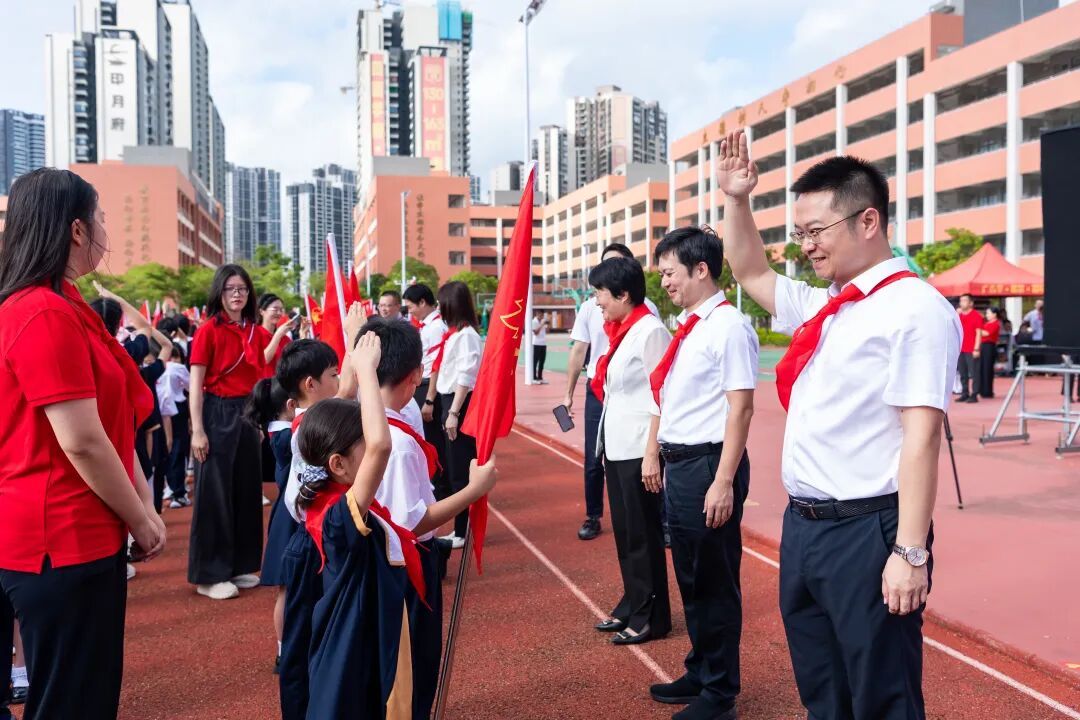仪式上,金湾学校少工委负责人宣读了新队员名单,批准二年级共529名同学正式加入中国少年先锋队。随后,领导嘉宾与老队员代表为新队员佩戴上鲜艳的红领巾。新队员们面向队旗,高举右拳,郑重宣誓:“我是中国少年先锋队队员……”铿锵誓言响彻会场,表达了他们为共产主义事业贡献力量的坚定决心。