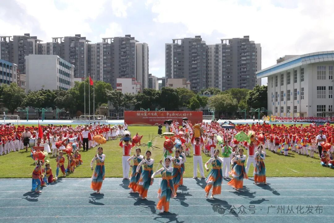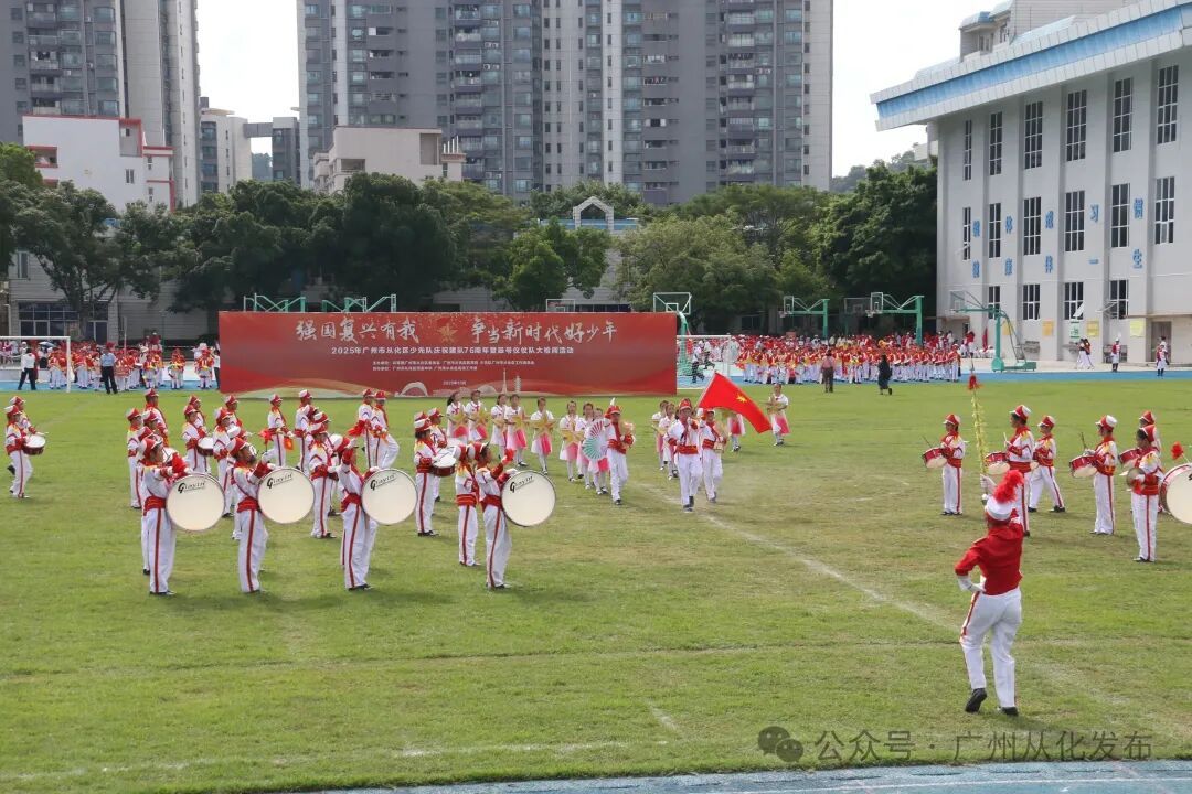 在从化区流溪中学,来自全区8所学校的鼓号仪仗队依次亮相,队员们号声嘹亮、步伐铿锵,以饱满的精神状态接受检阅,展现出从化少先队员们昂扬向上的风采。活动还融入了非遗水族舞等特色表演,将传统非遗与现代艺术形式相结合。充分彰显了全区少先队员听党话、跟党走的坚定决心。