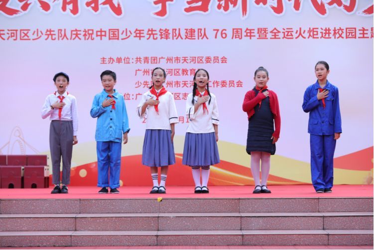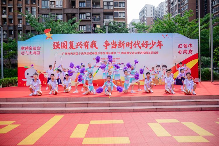 在天河区,志远小学迎来全运火炬,少先队员们以庄严仪式庆祝建队76周年。活动中展示了红色主题节目,并邀请三位体育冠军分享成长经历,鼓励队员拼搏追梦。火炬接力跑将活动推向高潮,熊熊燃烧的火炬象征着体育精神与强国使命的代代相传,现场队员庄严呼号,表达“强国复兴有我”的决心,立志勤奋学习、锤炼品格,争当新时代好少年,为实现中华民族伟大复兴贡献力量。