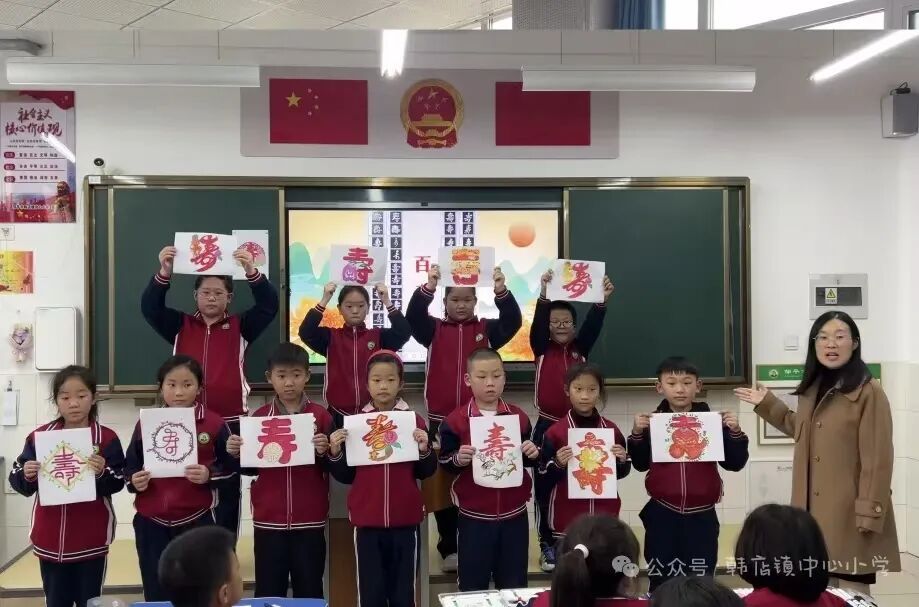 美术课的画纸上,更是藏满了对长辈的祝福。少先队员们握着彩笔,或工整写下不同字体的“寿”字,或在字旁添上挺拔的青松、饱满的仙桃、翩跹的仙鹤。一笔一画都格外认真,仿佛要把所有的美好祝愿,都融进这张“百寿图”里。