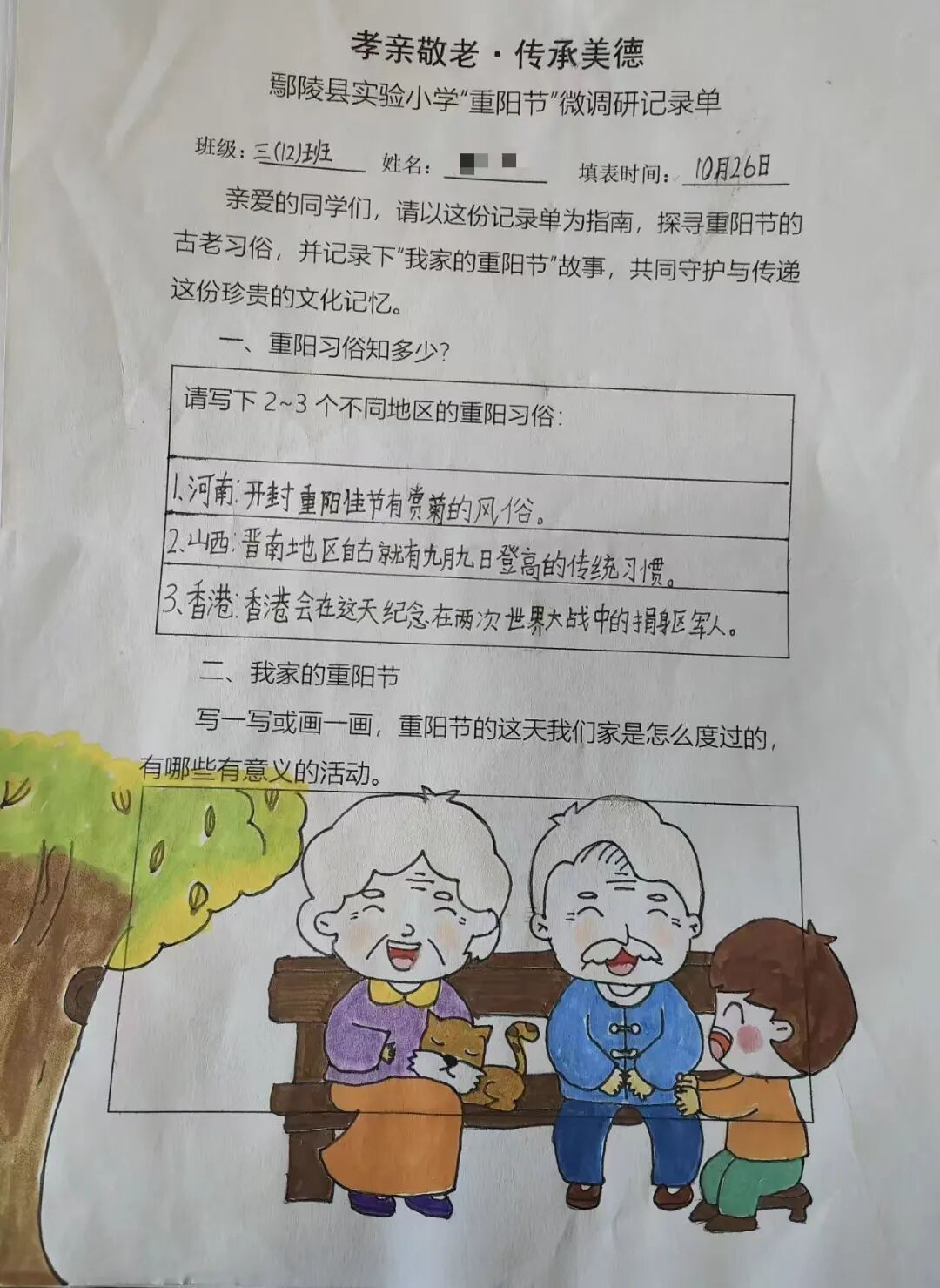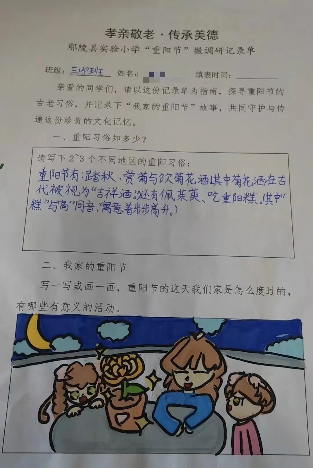 一笔一画记录习俗变迁,一言一语倾听岁月回响。三、四年级的少先队员们化身为“文化小侦探”,采访家中的长者,听奶奶讲她小时候的重阳;看爷爷画他记忆里的菊花酒。他们用笔记录,用图描绘,一张张A4纸上,不只是习俗的变迁,更是家国情怀的传承。