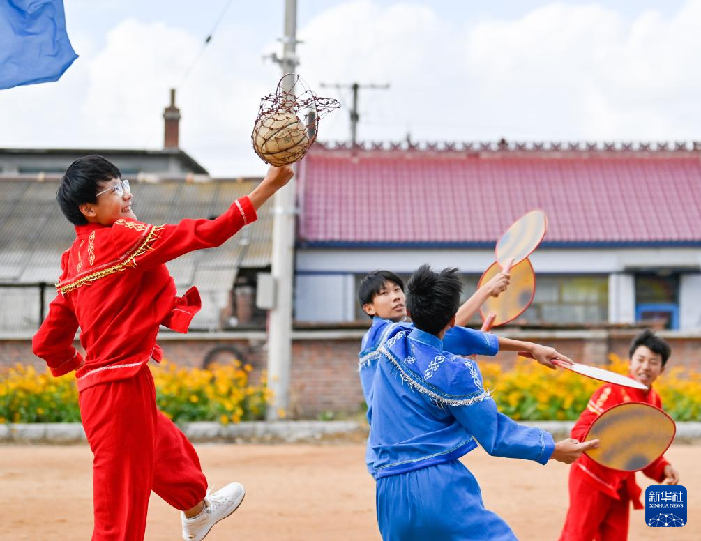 9月16日,乌拉街满族中学学生在比赛中接住珍珠球得分。