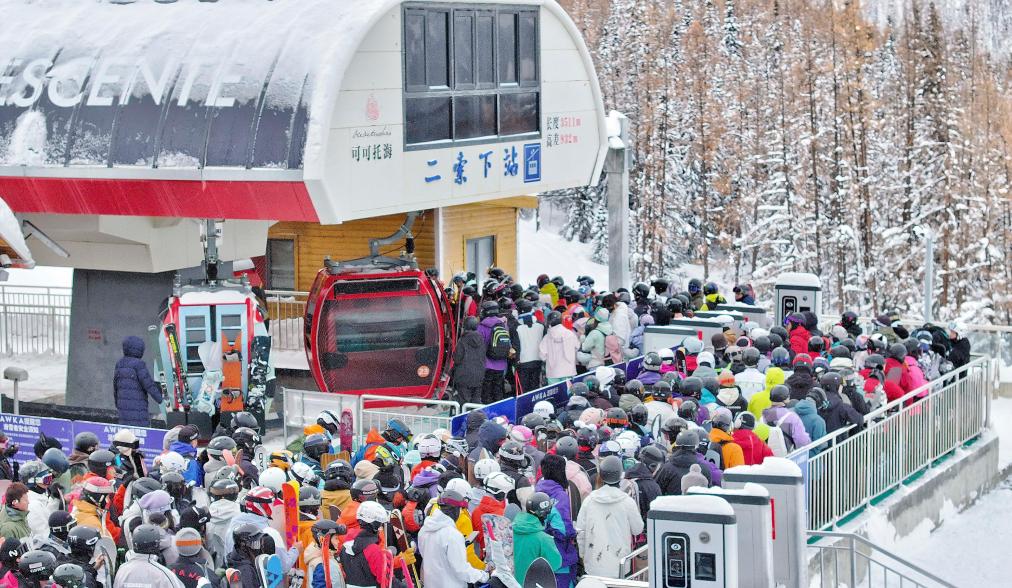 2024年11月,游客在可可托海国际滑雪度假区排队等候乘坐缆车。新华社记者 胡虎虎 摄