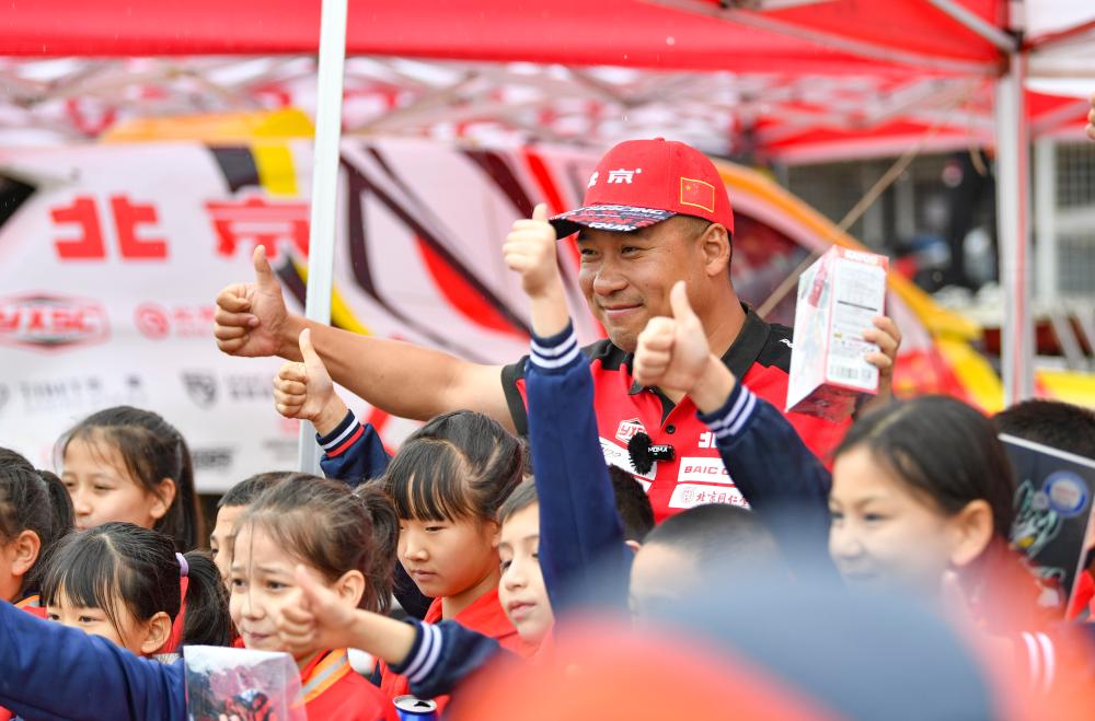 2023年5月,北京汽车车队领航员陈峰在环塔营地与当地小学生们合影。新华社记者 胡虎虎 摄