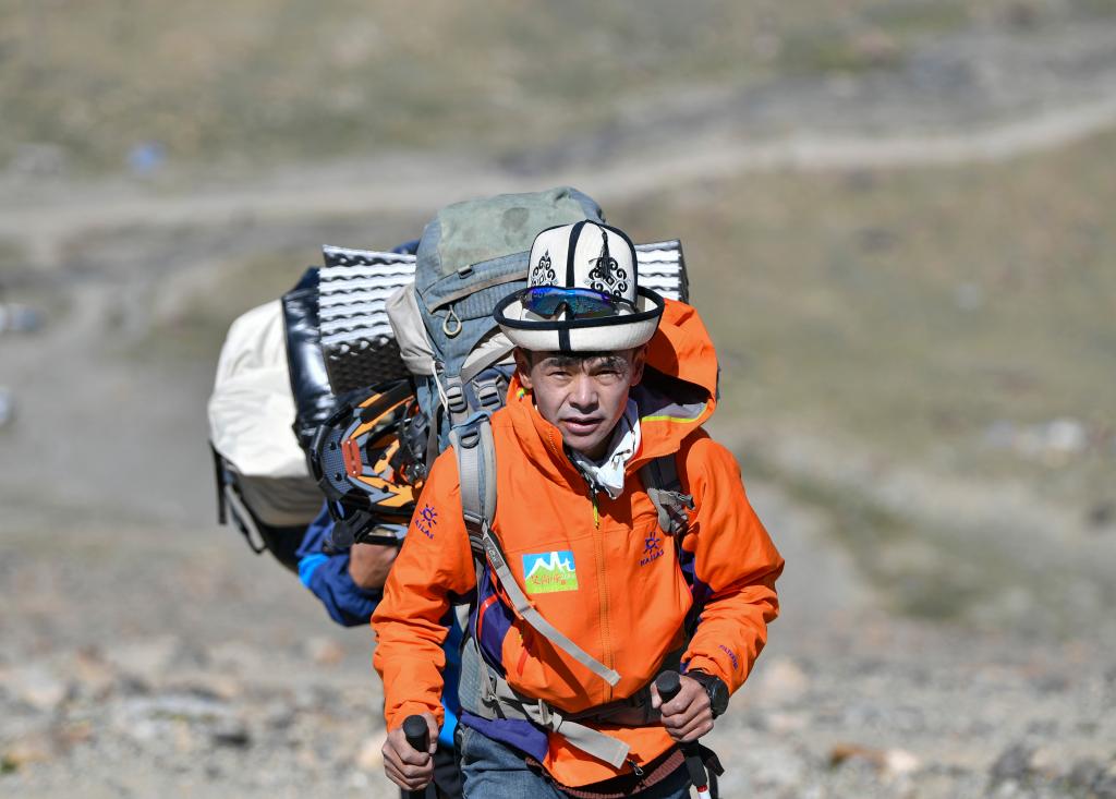 柯尔克孜族牧民塔西巴伊·加尼拜克服务登山队。新华社记者 胡虎虎 摄