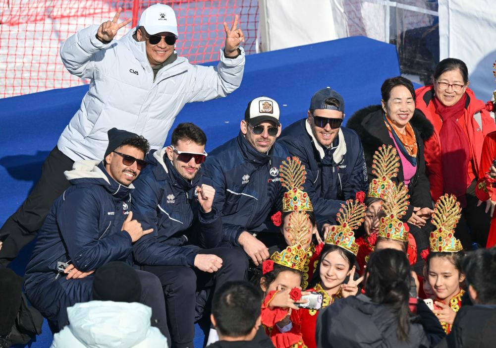 2025年2月,参加中国国际雪地排球邀请赛的法国选手与文艺表演者合影。新华社记者 胡虎虎 摄