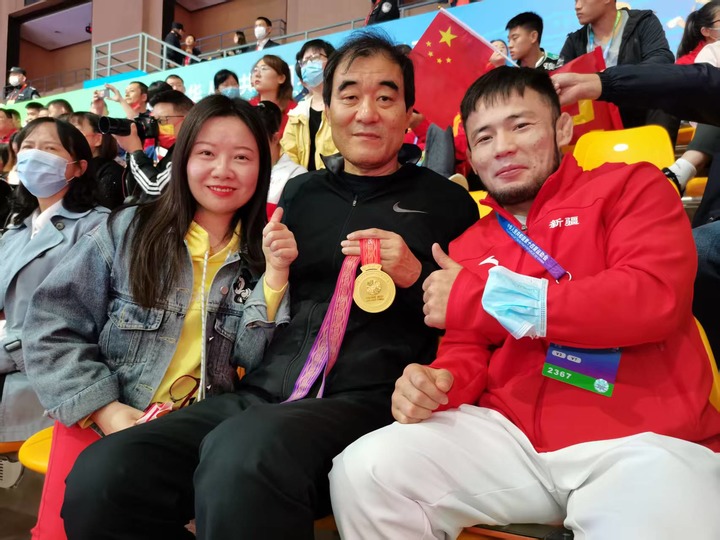 2021年陕西全运会期间,刘泳太(中)与夺得金牌的弟子托尔巴图(右)合影。