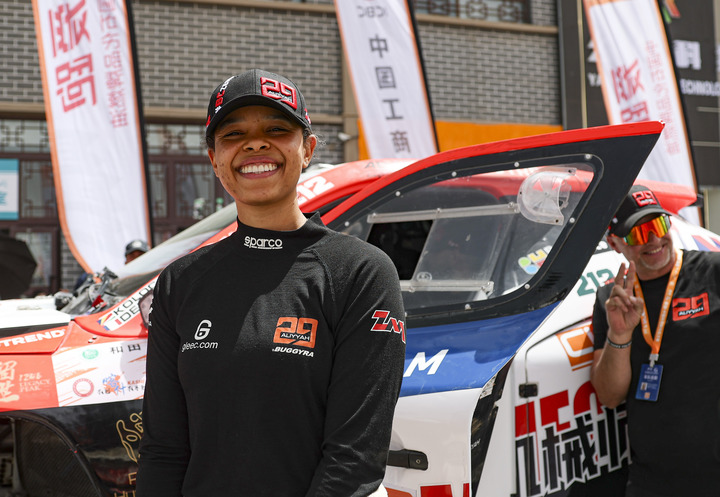 今年5月,阿莉亚在环塔拉力赛发车仪式上。新华社记者 胡星宇 摄