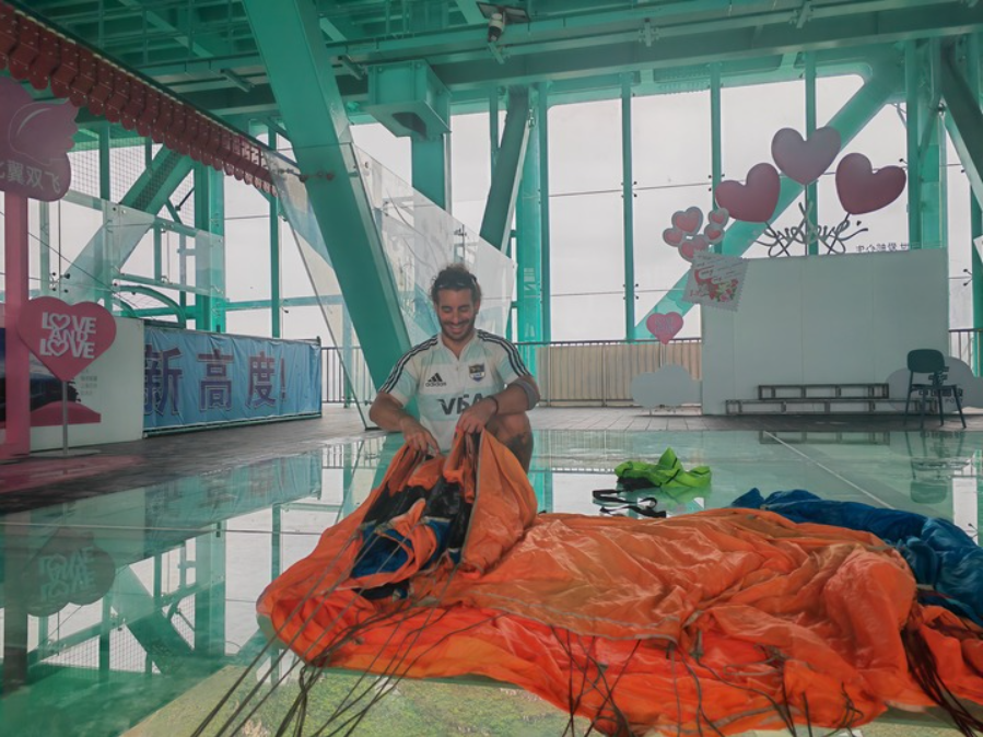 9月29日,意大利选手比多吉亚在整理飞行装备。新华社记者 吴思 摄