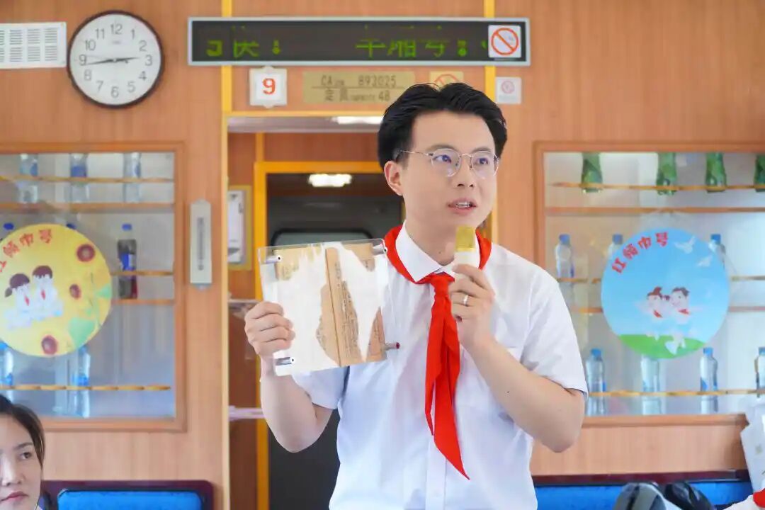 2025年5月,段志能在“红领巾号”列车上为赴北京参加中国少年先锋队第九次全国代表大会的江西代表宣讲少先队在安源的历史