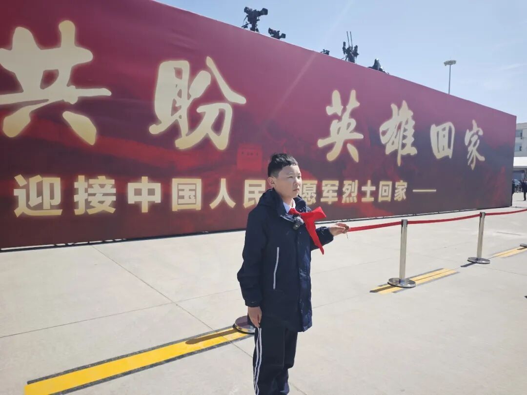 战机护航,礼兵护送,山河无恙,英魂安息。迎回人群中,有一个小小的身影格外引人注目。他叫杨家麒,是杨根思小学(河南许昌)一名四年级的少先队员。此刻,他小心翼翼地护着胸前的口袋,里面藏着一份沉甸甸的 “传家宝”——那是他从未谋面的太爷爷杨志喜的立功证明书、抗美援朝纪念章等物品。