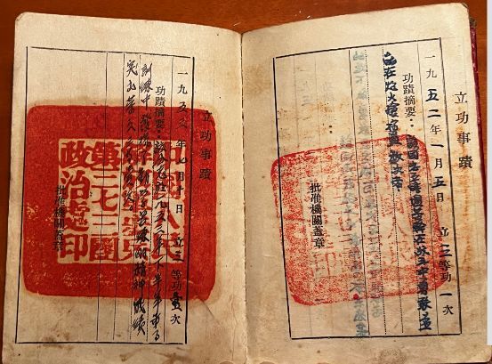 家麒和爸爸妈妈一起,专门找出了太爷爷兵役证、复员军人证明书、立功证明书,还有一枚抗美援朝纪念章。
