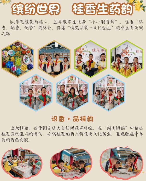 五年级以市花桂花为核心,开启跨学科制香探索!队员们先在自然中感知桂香、探寻其药用与文化价值,再分组调试线香、香膏配方,最后制作文创作品。整个过程中,感官体验、科学思维与文化认知相互赋能,让中医药魅力可触可闻可感。