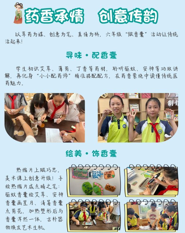 六年级将草药认知、科学配比与美术创意、文化传播跨学科融合,把传统藏进小小香囊!队员们先系统了解草药功效并完成配方搭配,再发挥创意用热缩片装饰香囊,最后化身文化小使者分享知识、赠送香囊。