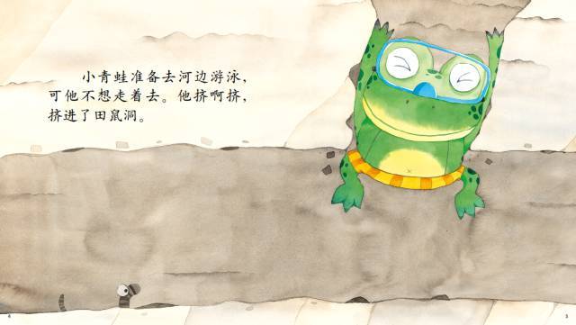 小青蛙准备去河边游泳,可他不想走着去。他挤啊挤,挤进了田鼠洞。