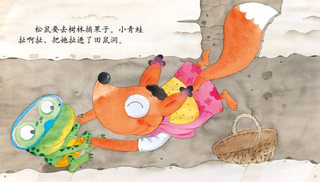 松鼠要去树林摘果子。小青蛙扯啊扯,把她扯进了田鼠洞。