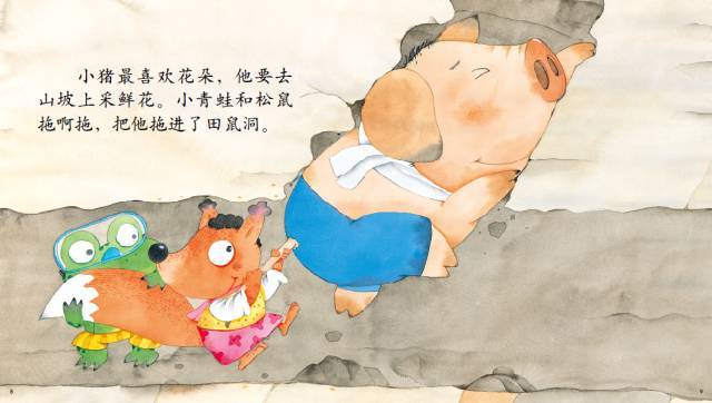 小猪最喜欢花朵,他要去山坡上采鲜花。小青蛙和松鼠拖啊拖,把他拖进了田鼠洞。