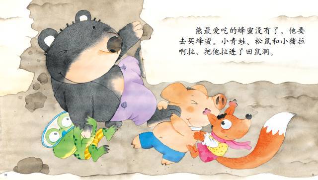 熊最爱吃的蜂蜜没有了,他要去买蜂蜜。 小青蛙、松鼠和小猪拉啊拉,把他拉进了田鼠洞。