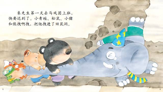 象先生第一天去马戏团上班,快要迟到了。小青蛙、松鼠、小猪和熊拽啊拽,把他拽进了田鼠洞。