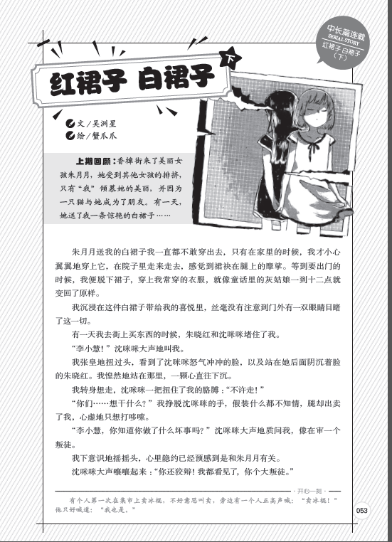 “上次舅舅给我带来了两条裙子,一条红的,一条白的,我觉得你穿白裙子一定很好看,我穿红的,这条白裙子送给你。”朱月月对我说。