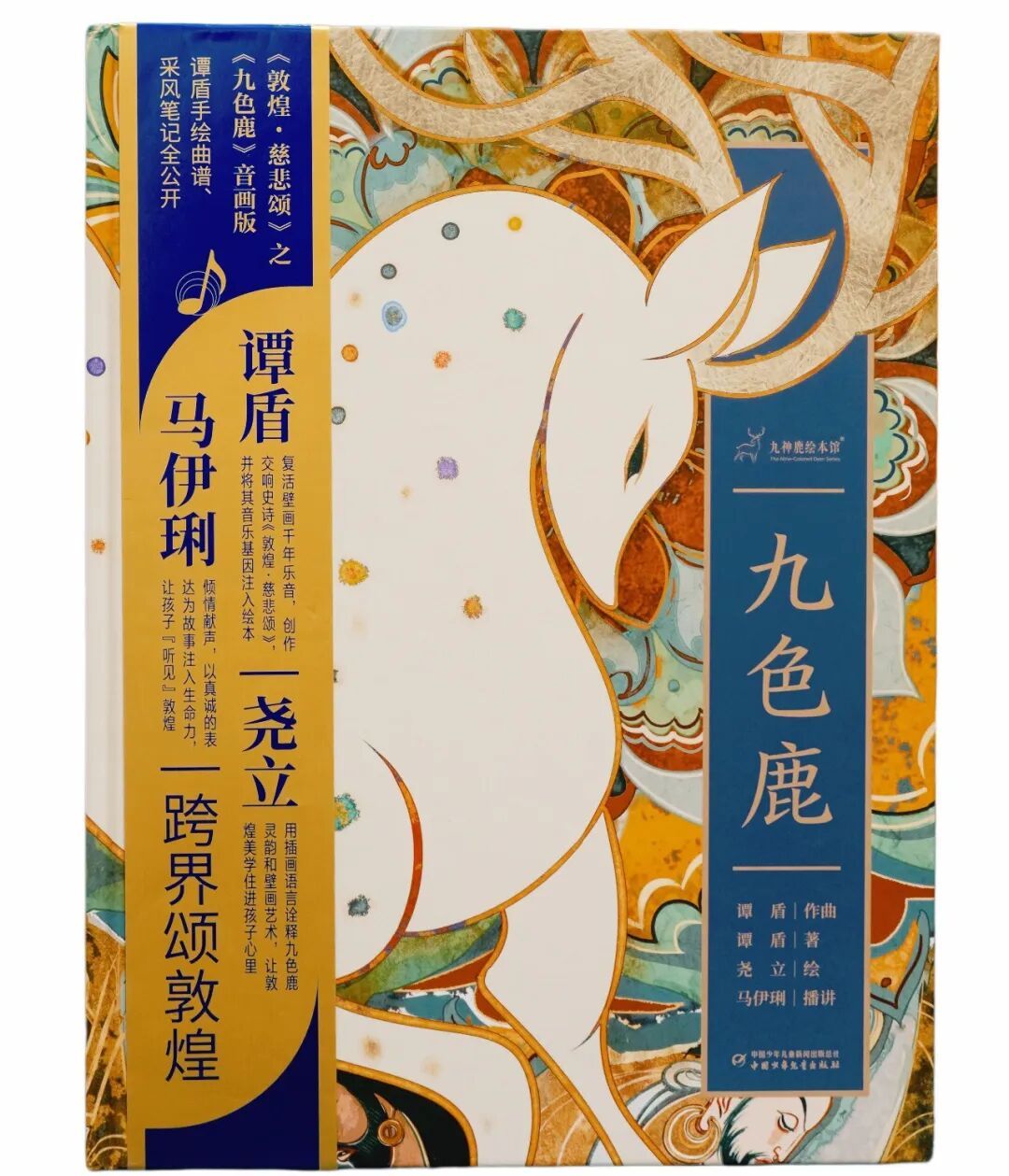 故事要从一段音乐讲起。作曲家谭盾受敦煌研究院老院长樊锦诗的邀约,耗时6年、十余次赴敦煌采风,创作了交响史诗《敦煌·慈悲颂》。这本《九色鹿》绘本,正是从那段音乐里“长”出来的——邀约送达尧立,她的任务是:把谭盾心目中的九色鹿,画给今天的孩子。