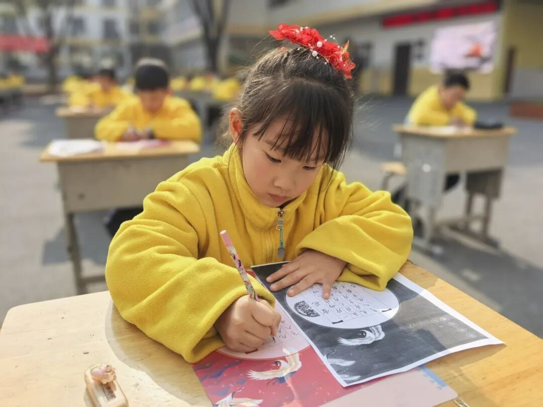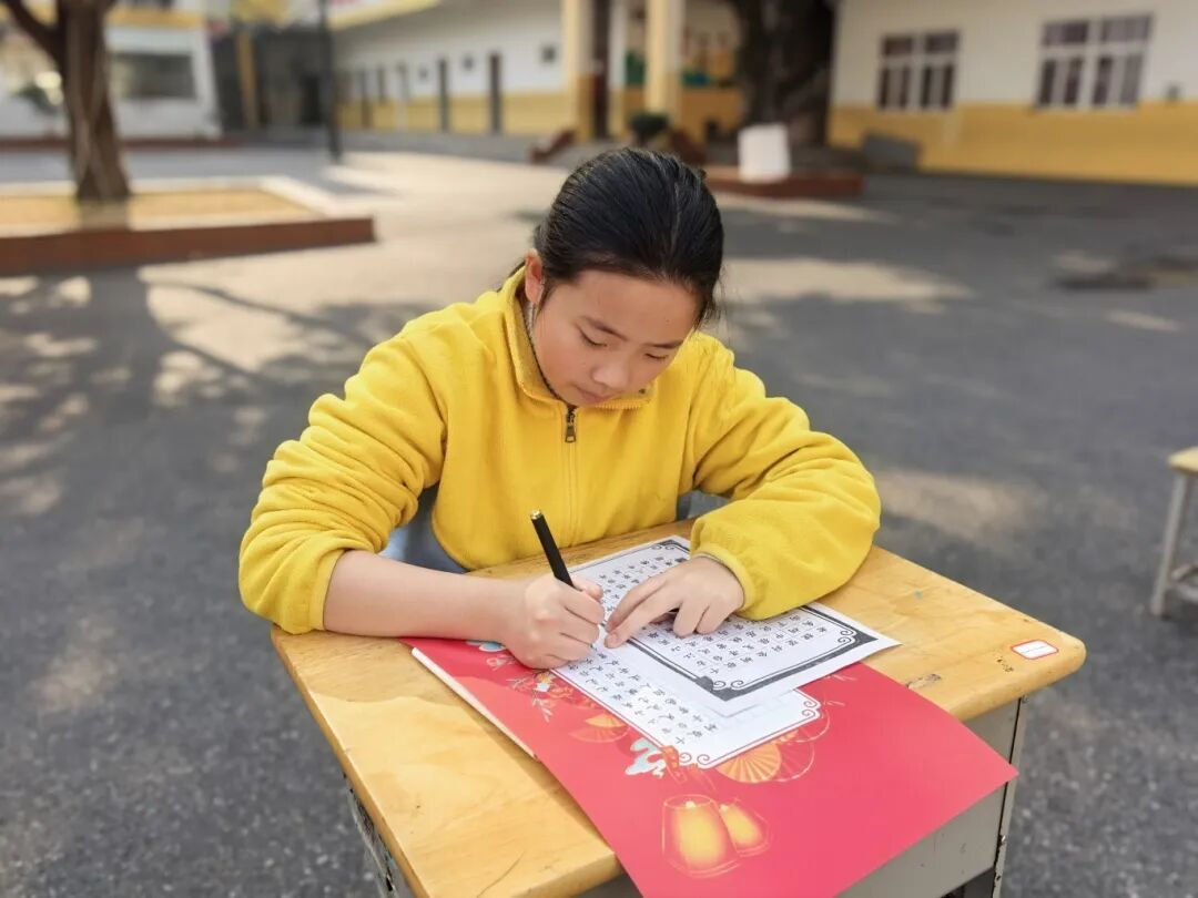 书写内容满载年味与诗情:低年级的《新春》《欢度春节》满是对新岁的朴素向往;高年级则提笔挥就《迎春歌》等古典诗篇。一横一竖,书写的是规矩方圆;一撇一捺,流露的是文化自信。