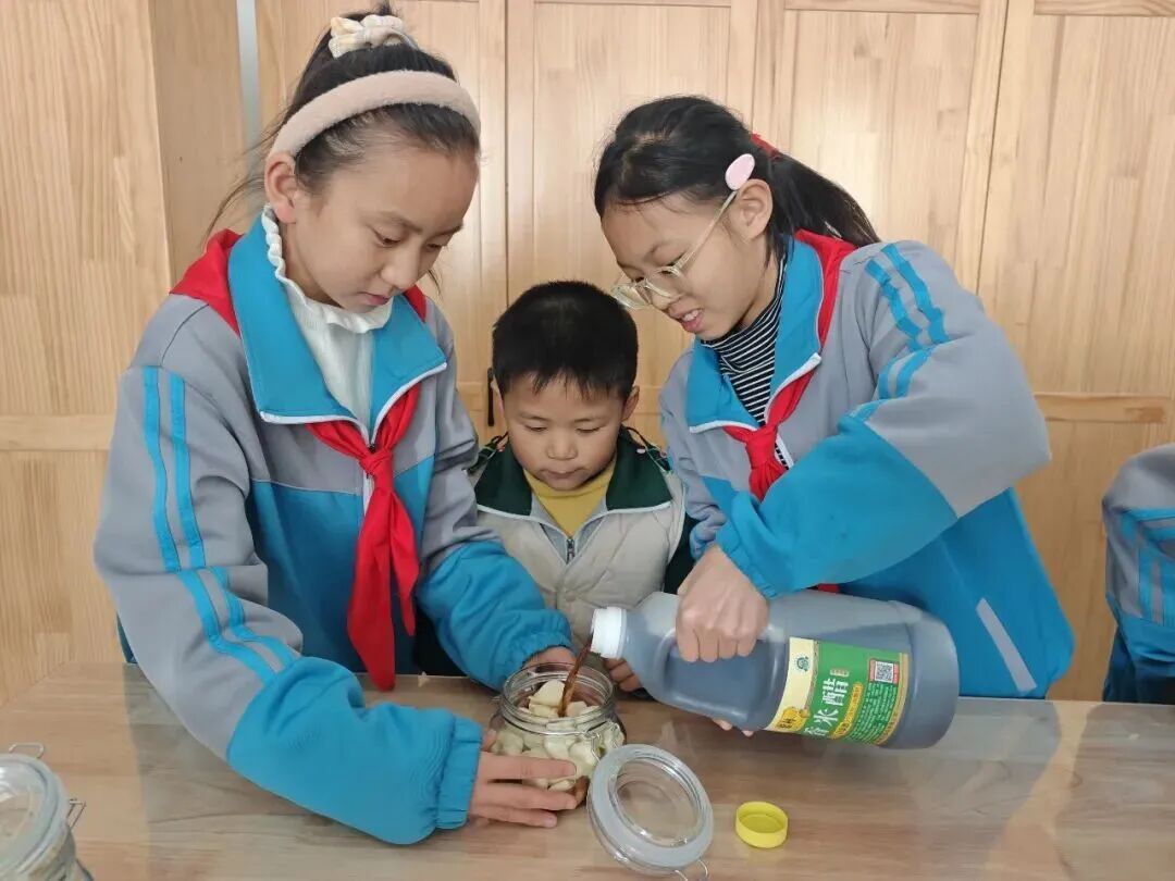 腊八节前夕,山东省胶州市李哥庄航文小学少工委以传统节日为契机,组织高年级队员与即将入队的同学们开展“制作腊八蒜,致敬环卫工”主题活动。活动前,即将入队的同学们在辅导员带领下学习少先队知识,牢记“为人民做好事”的入队要求,高年级队员主动协助,跨年级携手传递爱心。