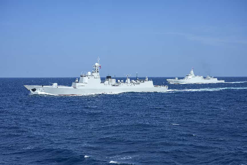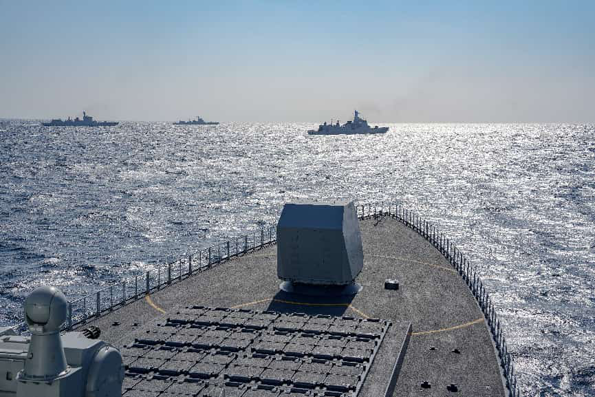 ↑舰艇编队在南海某海域开展多科目实战化训练现场。杨云翔 摄