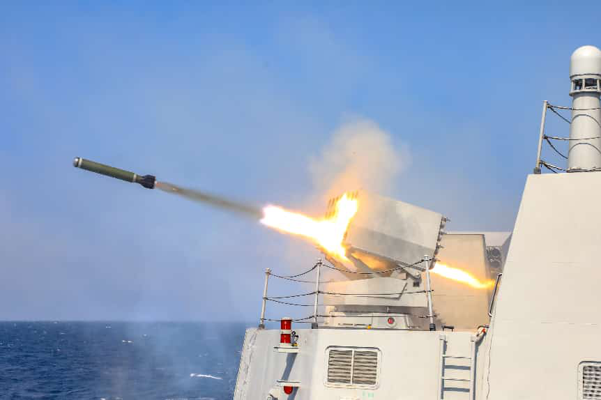 ↑大连舰向来袭目标发射干扰弹。施磊 摄