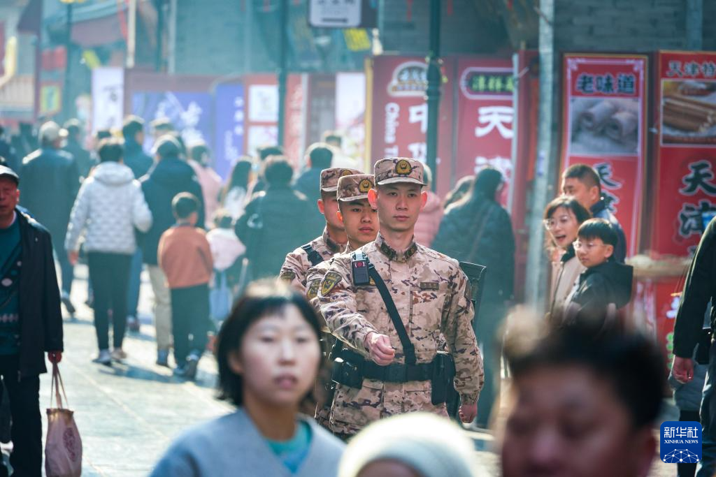 2月15日,武警天津总队执勤一支队官兵在天津古文化街执勤巡逻。
