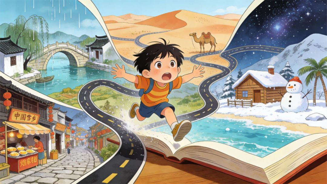 书中藏着许多“原来如此”的惊喜:山西的陈醋要晒三年才醇香,景德镇的瓷器要经过七十二道工序,桂林山水真的是“船在画中行”……这些生动的细节让每个地方都活了起来。我突然明白,“幅员辽阔”不只是课本上的四个字——它是东北的雪、江南的雨、西北的风、西南的歌,是千差万别却又和谐共生的风景。