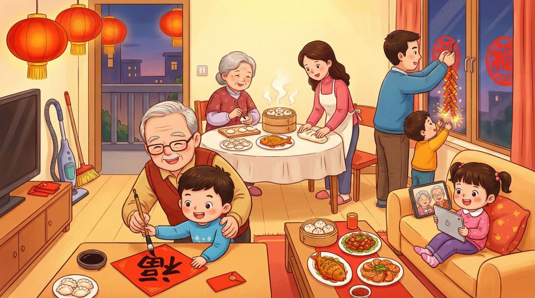 年俗里的幸福,藏在一家人的忙碌与欢笑中。腊月二十四,我们全家一起扫尘。奶奶说,这场全民参与的“扫尘”仪式,是辞旧迎新的老规矩。它是新年的序曲,扫去的不仅是家中的积尘,更扫出了一年的清新气象。贴春联时,爷爷教我辨认上下联,还握着我的手写下苍劲的字迹。墨香混着红纸特有的气息弥漫开来,每一个字都藏着传统文化的底蕴,也贴满了我们对新年的祝福。
