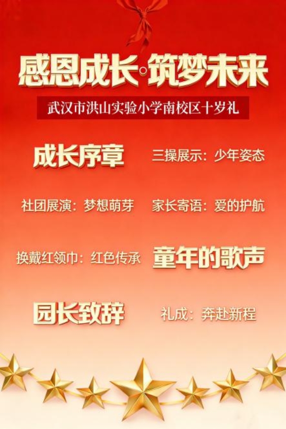2025年12月10日,武汉市洪山实验小学十岁礼暨第九届家长节活动温情启幕。本次活动以“感恩成长,筑梦未来”为核心主题,既是家校共育的深度联结,更是为孩子们的“幼学之年”镌刻成长印记的特别仪式。作为活动的顶层设计者与执行者,我们围绕环境打造、校园文化再设计、十岁礼主题体验三大核心亮点,让这场成长礼成为孩子、家长与学校共同的温暖记忆。