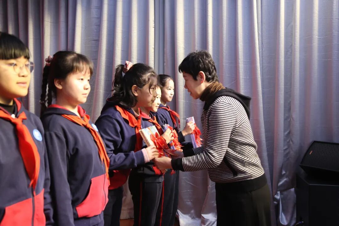 同时,中少总社也向全校三十个班级捐赠了图书。赠书涵盖红色经典、文学名著、科普读物等优质读物,品类丰富、内涵深厚,不仅丰富了学校的阅读资源,更为孩子们搭建了触手可及的阅读平台,让书香浸润校园每一个角落。东城区教育系统关工委副主任郭文伟、东城区教育系统关工委委员高琳向班级代表颁发赠书。