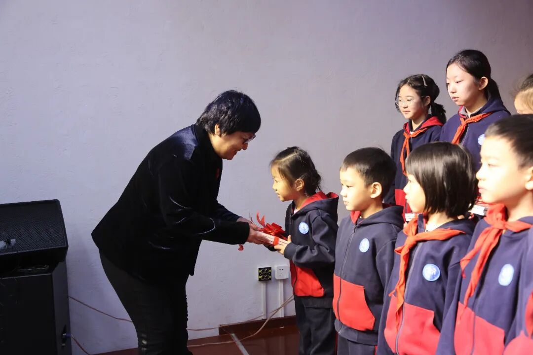 活动现场,中国少年儿童新闻出版总社向学校捐赠了“红领巾图书角”,安欣颖书记及少先队员代表共同领取标识。