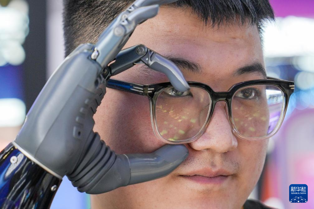 7月17日,在第三届中国国际供应链促进博览会数字科技链展区,一名右手残疾的工作人员佩戴智能仿生手后摘取眼镜。
