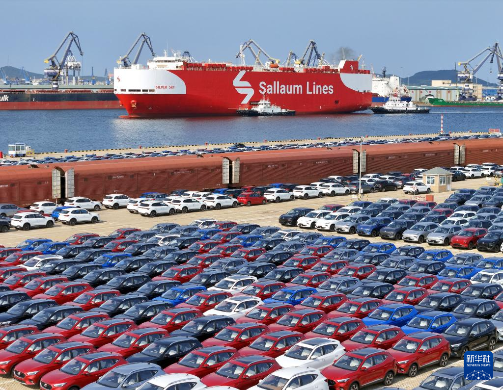 9月14日,国产汽车在山东港口烟台港集结等待装船出口(无人机照片)。