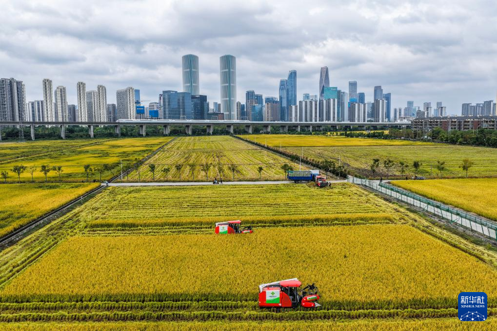 10月21日,在浙江杭州萧山区,收割机在稻田里收割水稻,远处高铁列车飞驰而过(无人机照片)。