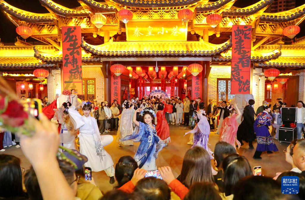 5月3日,游客在河北省秦皇岛市海港区秦皇小巷观看舞蹈演出。
