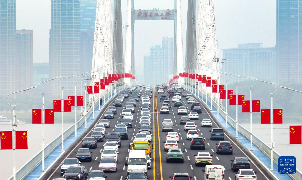 10月1日,国庆假期第一天,车辆行驶在湖北省武汉长江二桥上(无人机照片)。