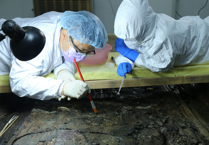 考古工作者在进行海昏侯墓园五号墓的内棺清理工作(2018年1月25日摄)。新华社记者 万象 摄