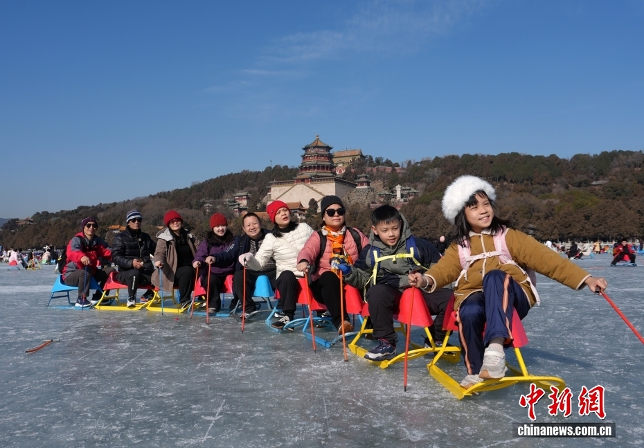 2月3日,游客抓住最后时机在北京颐和园冰场体验冰上乐趣。由于北京近日气温持续回升,颐和园冰场将提前至当日营业结束后正式关闭。