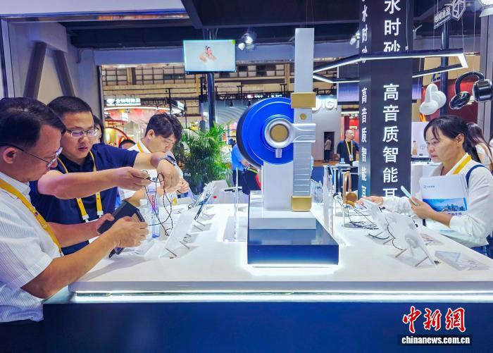 4月14日,参观者在试戴智能耳机。第六届中国国际消费品博览会正在海南海口举办,本届消博会汇聚国内多款智能科技产品。 记者 王晓斌 摄