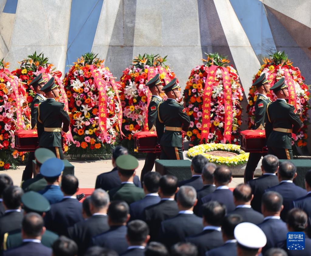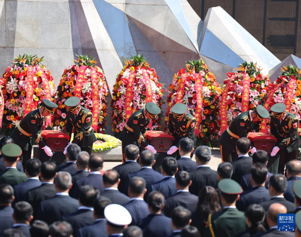 4月23日,礼兵护送志愿军烈士遗骸棺椁就位。新华社记者 韩赫 摄
