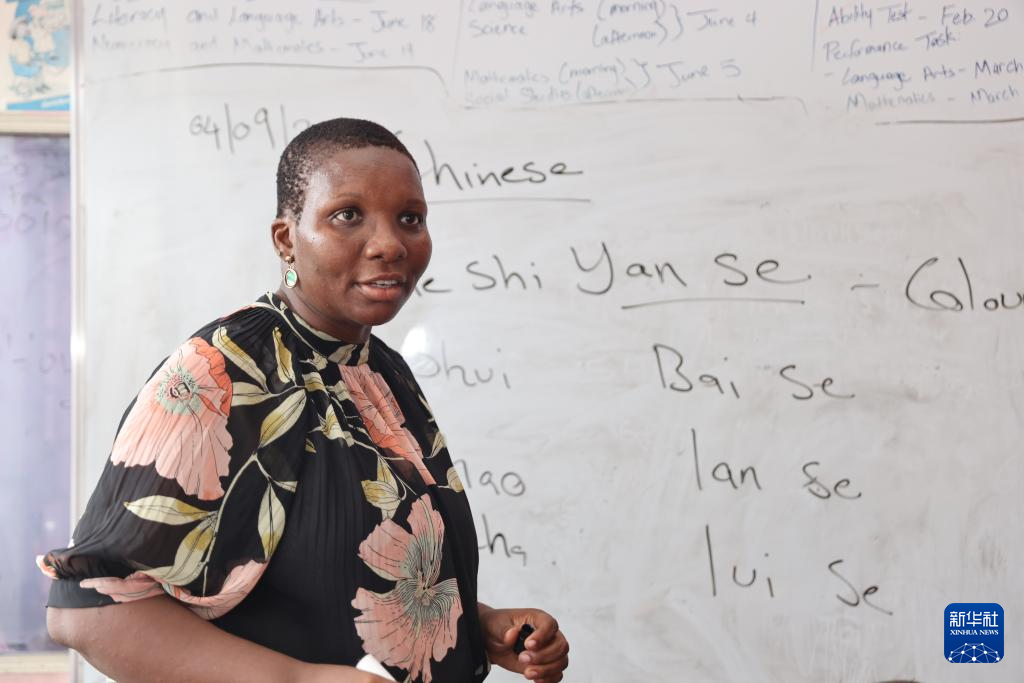 在牙买加首都金斯敦的一间教室里,艾特特殊教育小学校长娜塔莎·拉塞尔在黑板上书写着与颜色相关的汉字,孩子们端坐在椅子上,跟随她轻声朗读。教室里时而响起整齐的读书声,时而响起轻快的中文歌曲旋律。