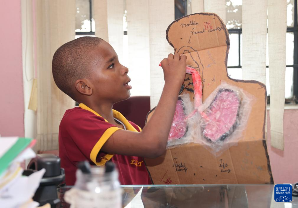 9月4日,在牙买加首都金斯敦艾特特殊教育小学,学生展示自己制作的手工作品。新华社记者 李梦馨 摄