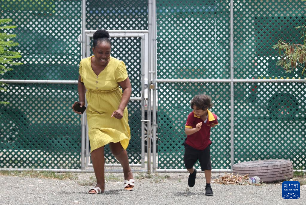 9月4日,在牙买加首都金斯敦艾特特殊教育小学,老师陪伴学生在操场玩耍。新华社记者 李梦馨 摄